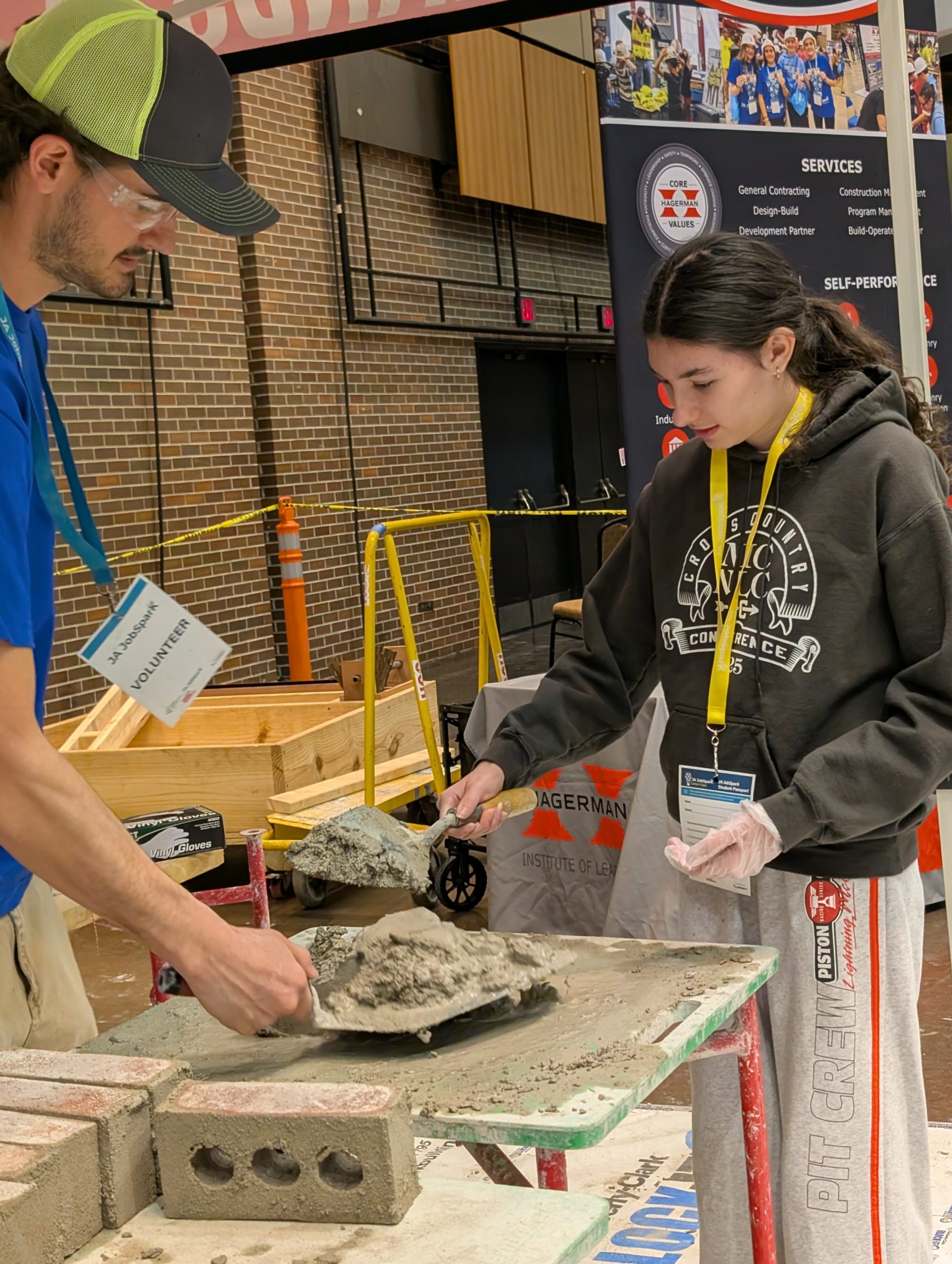 Two people working on a construction project at a convention center.